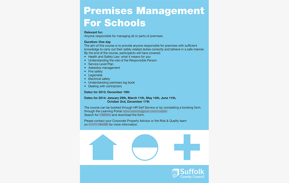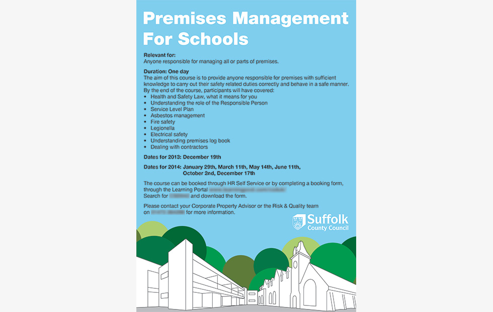 Flyers advertising the responsible person training course for schools, at Suffolk County Council.