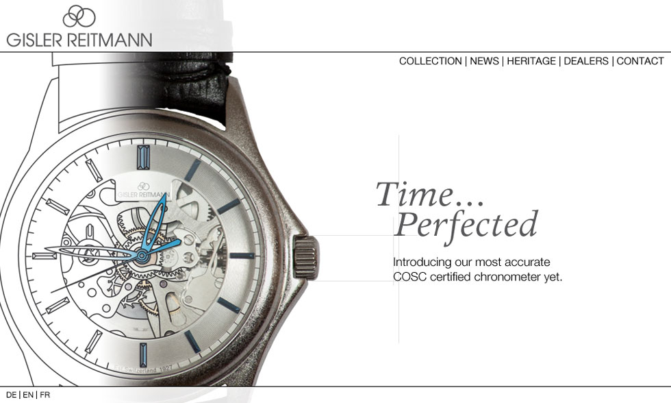 Logo and homepage design for a luxury Swiss watch brand, Gisler Reitmann. Gisler Reitmann pride themselves on the precision of their hand built, mechanical watches.