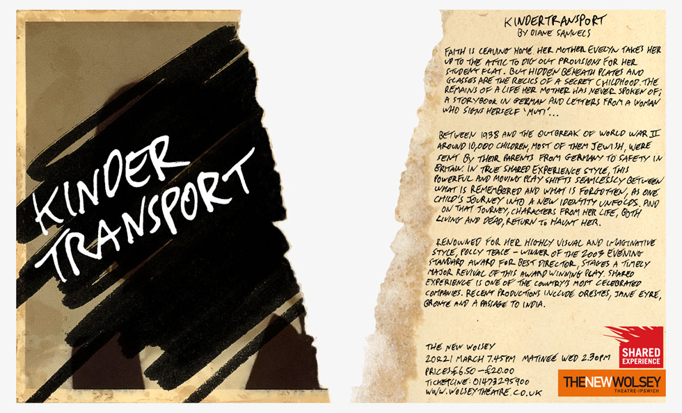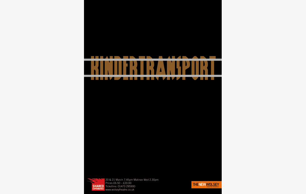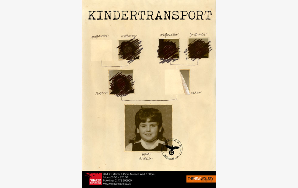 Kindertransport is a play by Diane Samuels which examines the life, during World War II and afterwards, of a Kindertransport child. Jewish children, no adults, were transported out of Germany, to Britain by the British Government, to spare them the horrors of the treatment of Jews in Germany. They lost all connection with their old lives and families. The posters are designed to symbolise both points.